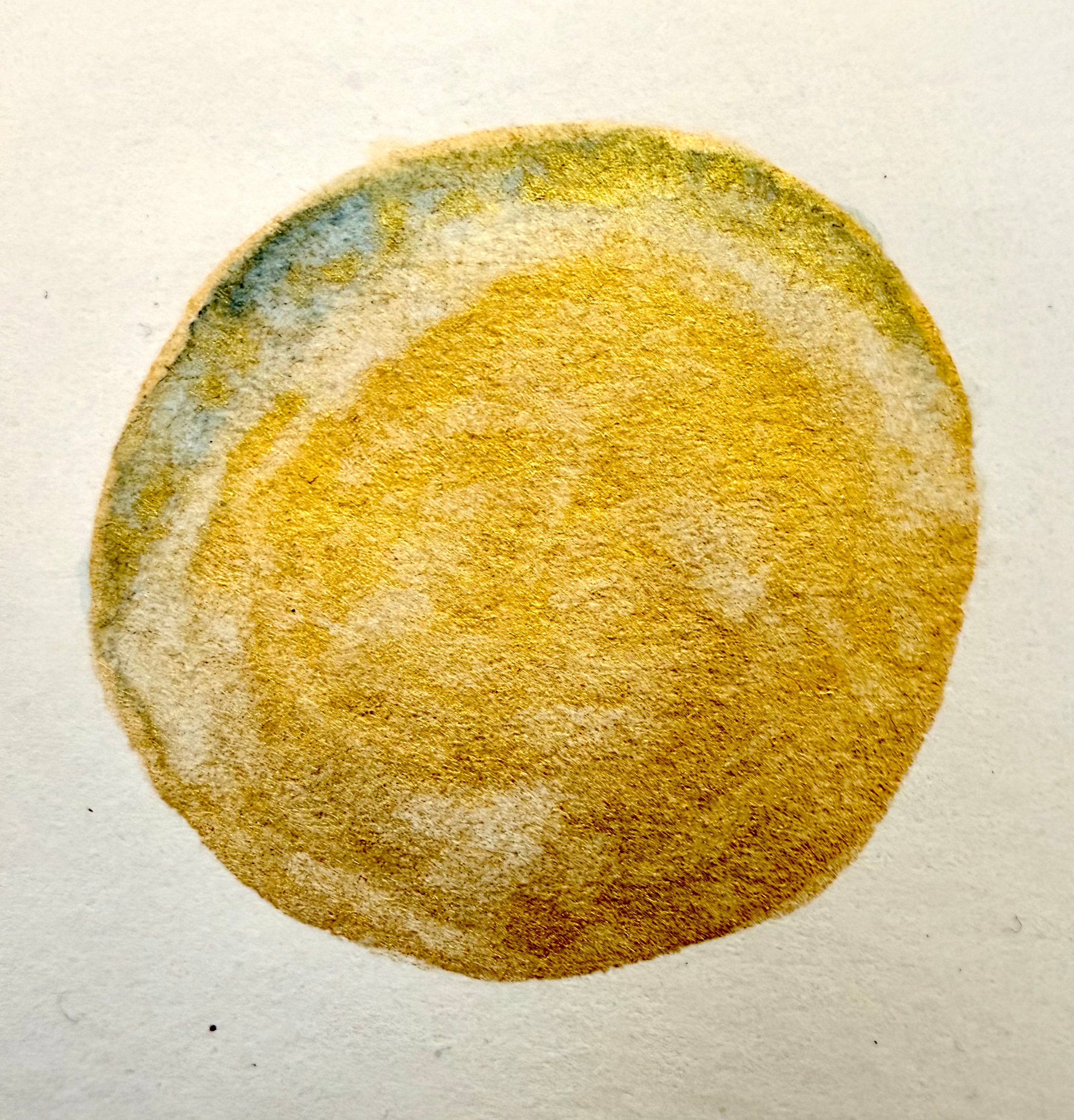 I continue to think about how I might write resistance in a way that works for me. I feel my voice stiffen unappealingly when I try to write toward the emergencies of our national and global climate, the growing threats to democracy. I sound like a scold, a lot like I do IRL when I’m haranguing the teenager about cleaning her car or using the dining table as a dumping ground. There’s a tightening and souring of tone I seem unable to avoid, and it doesn’t do my message any favors. To the contrary, my writing shines when it’s infused with joy, a sense of the carefree, a bit of humor (at least I amuse myself!). But (and here I am talking to myself) while that’s all well and good, the game done changed, and you simply must write in the broader context of your country in crisis. You must acknowledge what’s happening “out there”/”to us all” and speak directly to dire reality. No more la-la-la beauty, la-la-la delight, I mean I never meant it that way in the first place!—but what’s implied in my brain may not radiate on the page unless I use the big bright loud metallic gold paint. So I’m using it. And not just figuratively. I’ve been messing around with actual gold paint, watercoloring circles. This feels soothing right now.